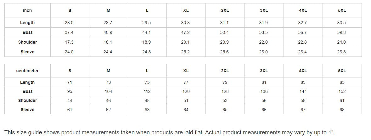 inch | S | M | L | XL | 2XL | 3XL | 4XL | 5XL |