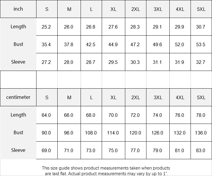inch | S | M | L | XL | 2XL | 3XL | 4XL | 5XL |