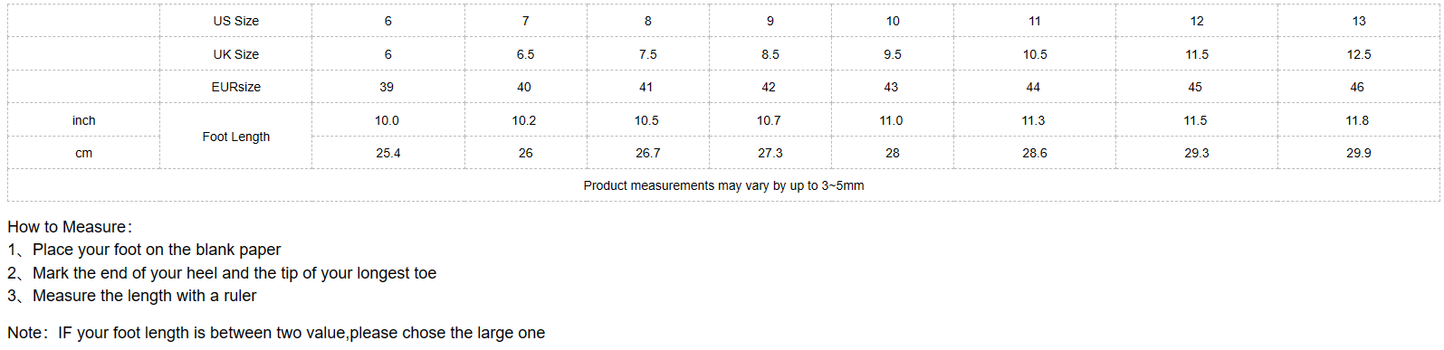 UK Size | 6 | 6.5 | 7.5 | 8.5 | 9.5 | 10.5 | 11.5 | 12.5 | |