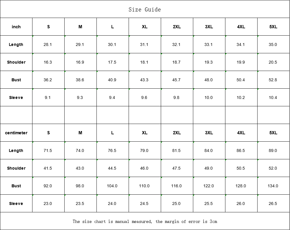 inch | S | M | L | XL | 2XL | 3XL | 4XL | 5XL |