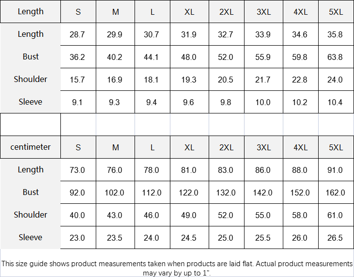 Length | S | M | L | XL | 2XL | 3XL | 4XL | 5XL |