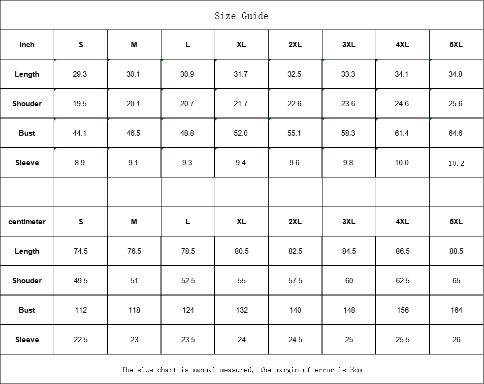 The size chart is manual measured, the margin of error is 3cm.