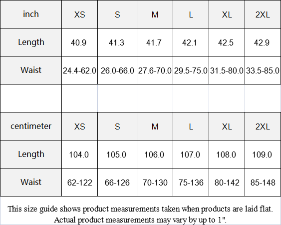 Waist | 24.4-62.0 | 26.0-66.0 | 27.6-70.0 | 29.5-75.0 | 31.5-80.0 | 33.5-85.0 |
