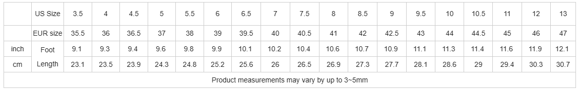 US Size | 3.5 | 4 | 4.5 | 5 | 5.5 | 6 | 6.5 | 7 | 7.5 | 8 | 8.5 | 9 | 9.5 | 10 | 10.5 | 11 | 12 | 13 | |